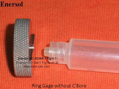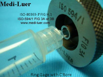 Testing the Luer-Slip male conical fitting of ISO 594/1 is easier than testing the Lure-Lock male conical fitting of ISO 594/2. The Lure-Lock male conical fitting of ISO 594/2 has a threaded lock collar surrounding the male conical fitting which inhibits the application of a ring gage. Medi-Luer offers solutions to this problem of clearing the ISO 594/2 Threaded Lock Collar.